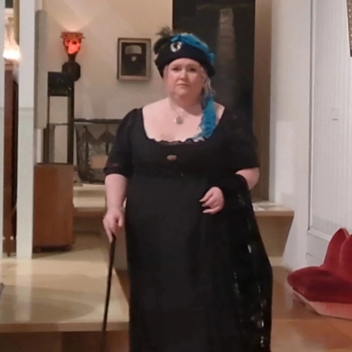 Instead I opted for a satin backed crepe black gown in the Regency style.